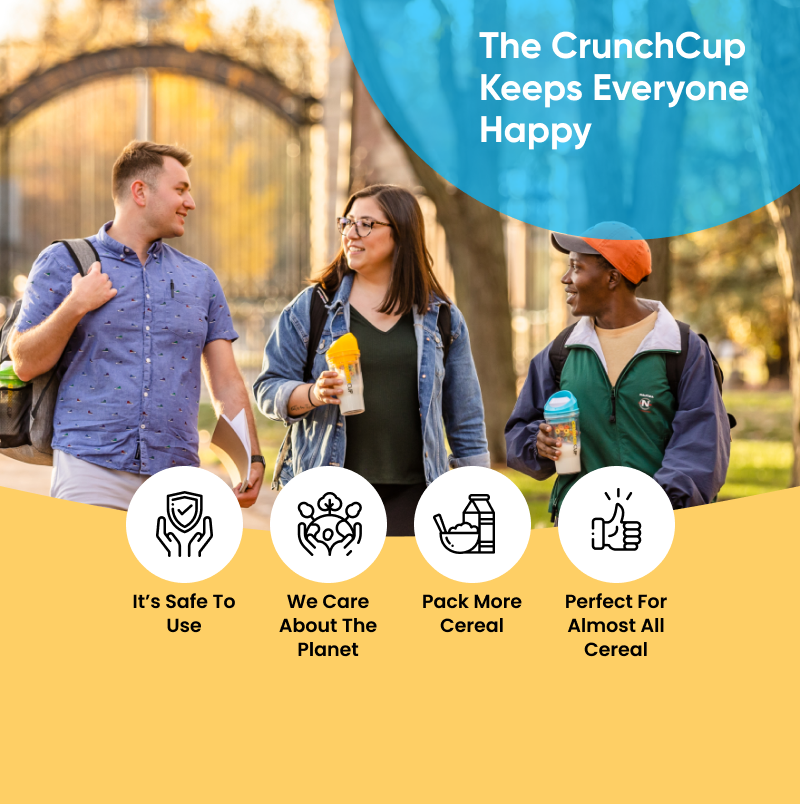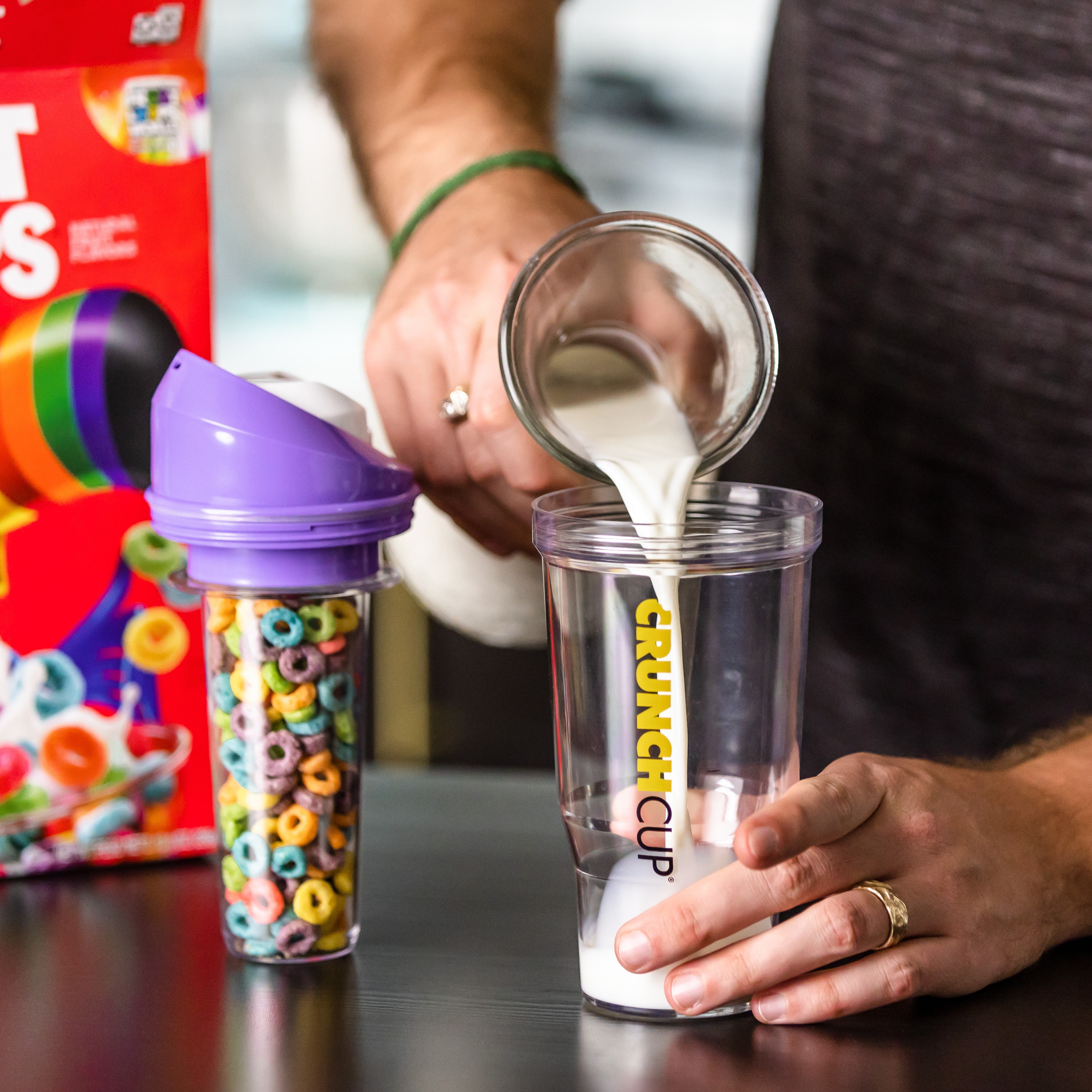 A: The CrunchCup® holds just under 2 servings of your favorite cereal and milk portions, allowing you to have cereal twice a day or share it with a friend.